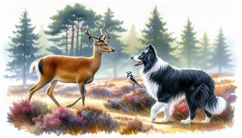 Hoi, ik ben Rex, een vrolijke border collie met een kwispelende staart en een neus altijd in de wind. Vandaag was een bijzondere dag. Terwijl ik over de hei rende, met mijn poten door het zachte gras, zag ik plots iets bewegen tussen de struiken. Een hertje!