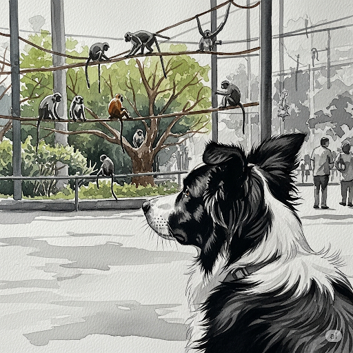 Ik spring en blaf van enthousiasme. Ik kan niet wachten om te ontdekken welke nieuwe geuren ik vandaag ga ruiken. Mijn baasje doet mijn riem om, en samen lopen we de dierentuin in. Het is er best druk, en ik zie allemaal kinderen lachen en rondrennen. Bazinnetje pakt mijn riem over van mijn baasje.
