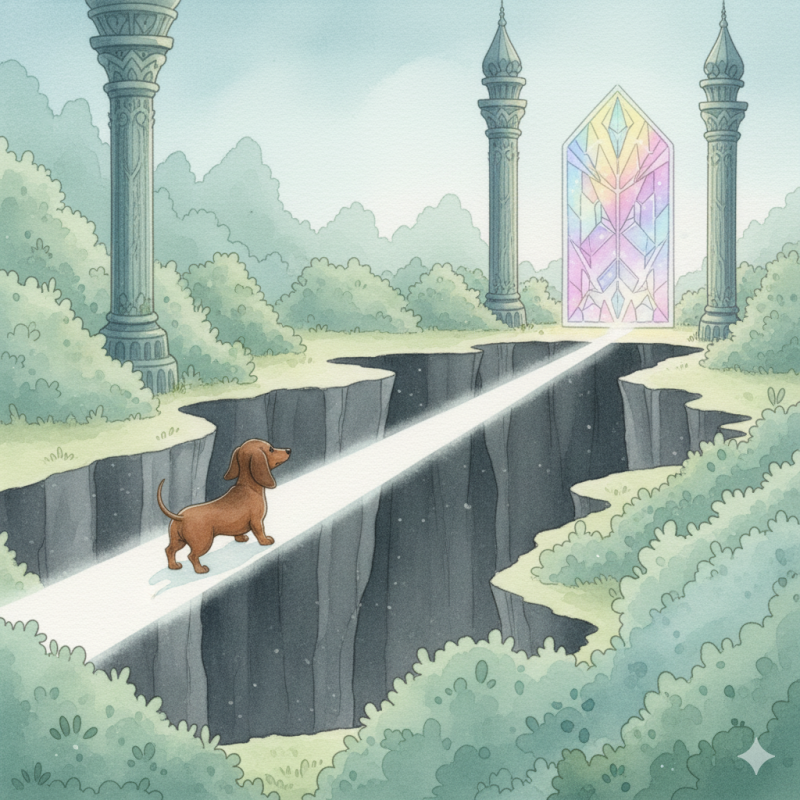 Toby slikte. Zijn pootjes trilden. Maar hij zette één stap… en nog één. Bij elke stap groeide het licht onder hem. Toen hij de overkant bereikte, verscheen er een poort van kristal.