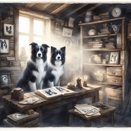 We renden erheen, onze vachten druipend van het water. De hut rook naar oud hout en geheimen. Binnen was het koel en stil. Op een plank lag een oud boek, half open, met tekeningen van honden. Border collies, setters, retrievers. En tussen de pagina’s zat een foto. Een jonge border collie en een Ierse setter, samen op een veld. Ik snuffelde eraan. Het rook naar avontuur van lang geleden.