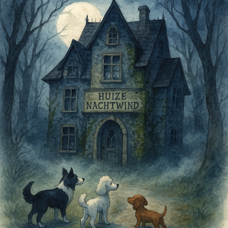Tussen de bomen doemde een oud, vervallen huis op. De ramen waren gebarsten, het dak scheef, en een klimop slingerde zich als vingers om de muren. Een bord hing scheef aan de poort: “Huize Nachtwind”.