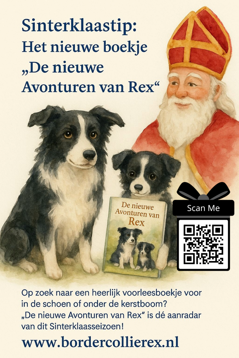 Rex ging liggen, zijn ‘baard’ half op de grond, en dacht: Als hij straks ook nog liedjes gaat zingen, wil ik wel een extra beloning… misschien een hele zak pepernoten.