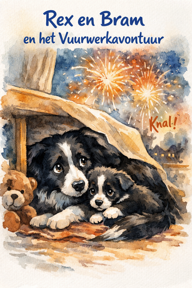 De dagen voor oud en nieuw waren altijd een beetje spannend voor Rex en zijn puppybroertje Bram. Rex was een zwart-witte border collie met slimme ogen en zachte oren. Hij deed altijd alsof hij heel dapper was, maar diep vanbinnen vond hij vuurwerk helemaal niet leuk. Bram, zijn kleine puppybroertje, keek altijd alles van Rex af. Als Rex schrok, schrok Bram nog harder.