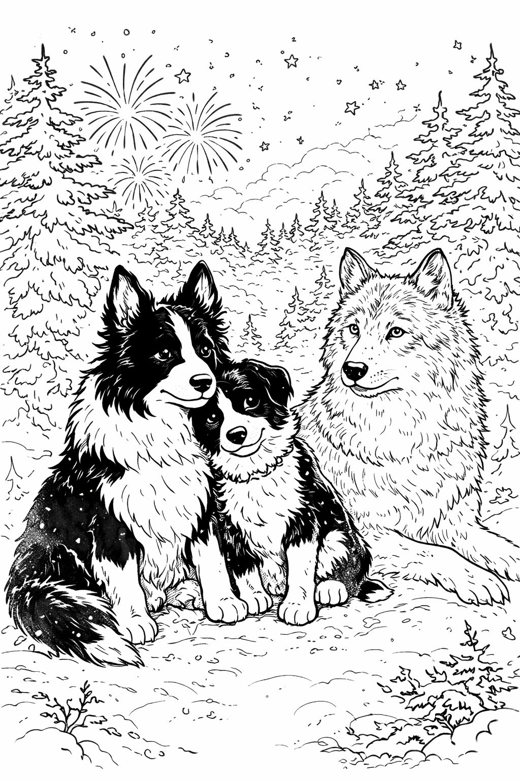 Het was de dag voor oudejaarsavond. In het grote bos lag een dun laagje winterkou over de bomen en de wereld voelde stil... maar toch een beetje spannend. Rex, de zwart witte border collie, liep dapper voorop. Achter hem huppelde Bram, zijn kleine puppybroertje, vol nieuwsgierigheid en met glinsterende oogjes.