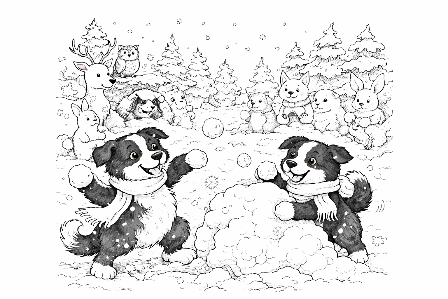 Diep in het Grote Dierenbos lag een dikke, glinsterende laag sneeuw. De bomen droegen witte mutsen en overal fonkelden ijskristalletjes in het zachte winterzonnetje. Rex, de grote zwart-witte border collie, sprong vrolijk door de sneeuw. Zijn puppybroertje Bram huppelde lachend achter hem aan, zijn pootjes maakten kleine afdrukken in het wit.