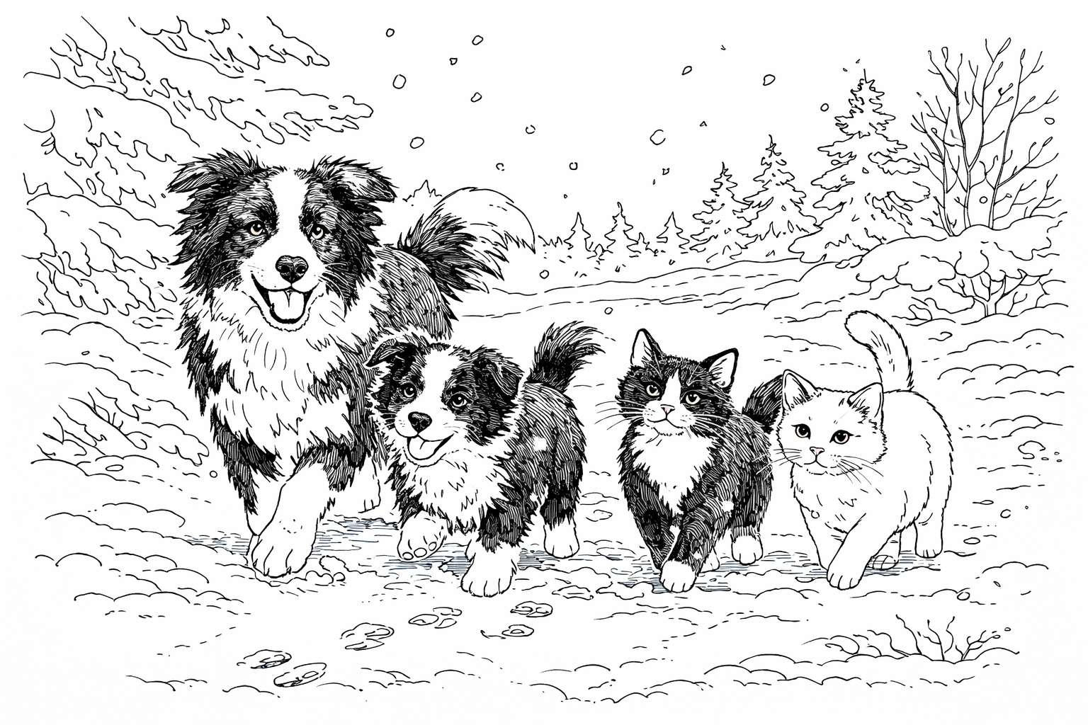 Op een open plekje stopten ze even. Ze maakten pootafdrukken in de sneeuw, speelden samen en genoten van het stille winterbos. Ondanks de kou voelde het warm, want ze waren samen — als echte huisgenootjes én vrienden.