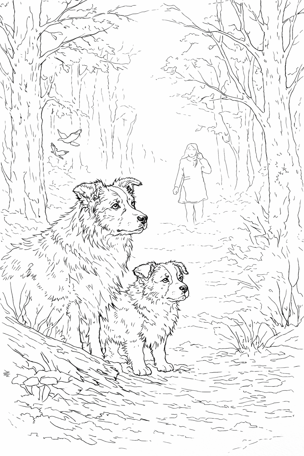 Het was een frisse ochtend toen Rex en Bram samen met hun bazinnetje het grote bos in gingen. Een dunne mist hing tussen de bomen en maakte alles stil en geheimzinnig. Rex, de grote zwart-witte border collie, liep alert voorop. Zijn puppybroertje Bram huppelde vrolijk achter hem aan, nieuwsgierig snuffelend aan elk blaadje en takje.