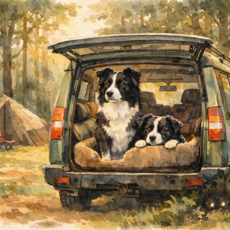 De achterbak was gevuld met tenten, dekens en een grote mand waar Rex en Bram precies samen in pasten.