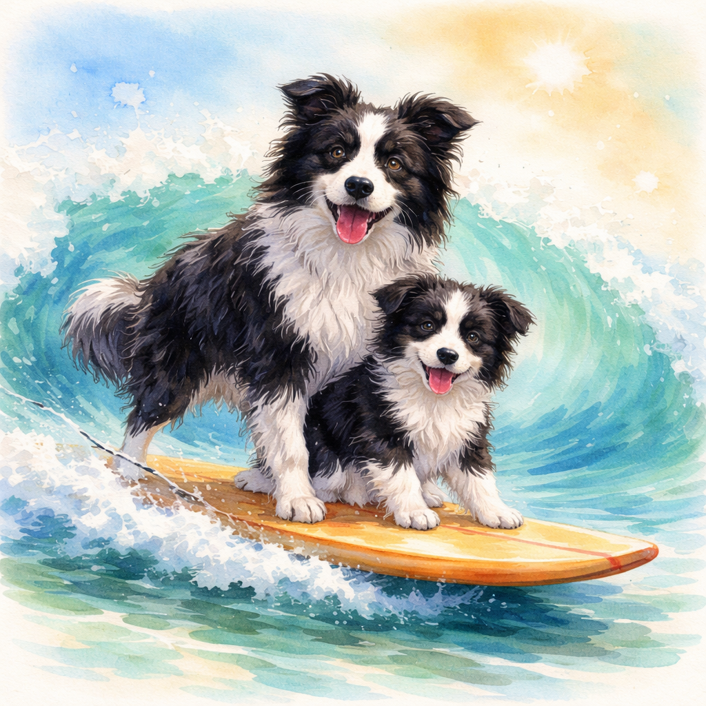 Samen hielden ze hun evenwicht, staart omhoog, ogen stralend. Mensen op het strand klapten en lachten toen ze de twee zwart-witte border collies zagen surfen alsof ze het al jaren deden.