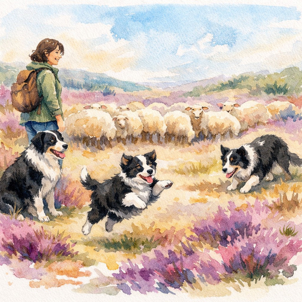 Een grote kudde schapen graasde rustig tussen de heidestruiken. En daar, aan de zijkant van de kudde liep een prachtige zwart-witte border collie. Met een scherpte blik en snelle poten hield hij de schapen netjes bij elkaar. Zodra een schaap iets te ver afweek, rende hij er soepel omheen en bracht het weer terug.