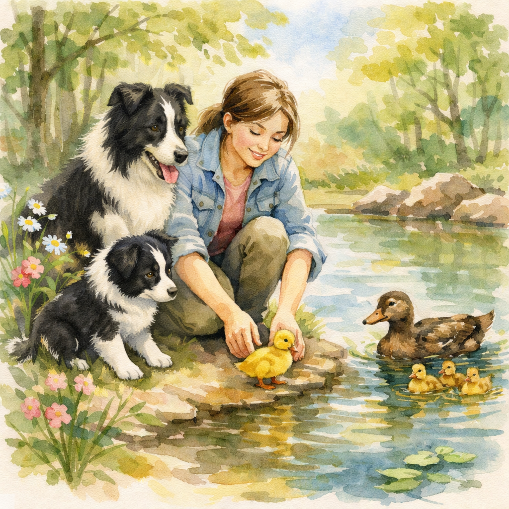 Heel voorzichtig tilde ze het kleine eendje op. Rex en Bram liepen netjes naast haar terwijl ze richting het waterpad gingen.