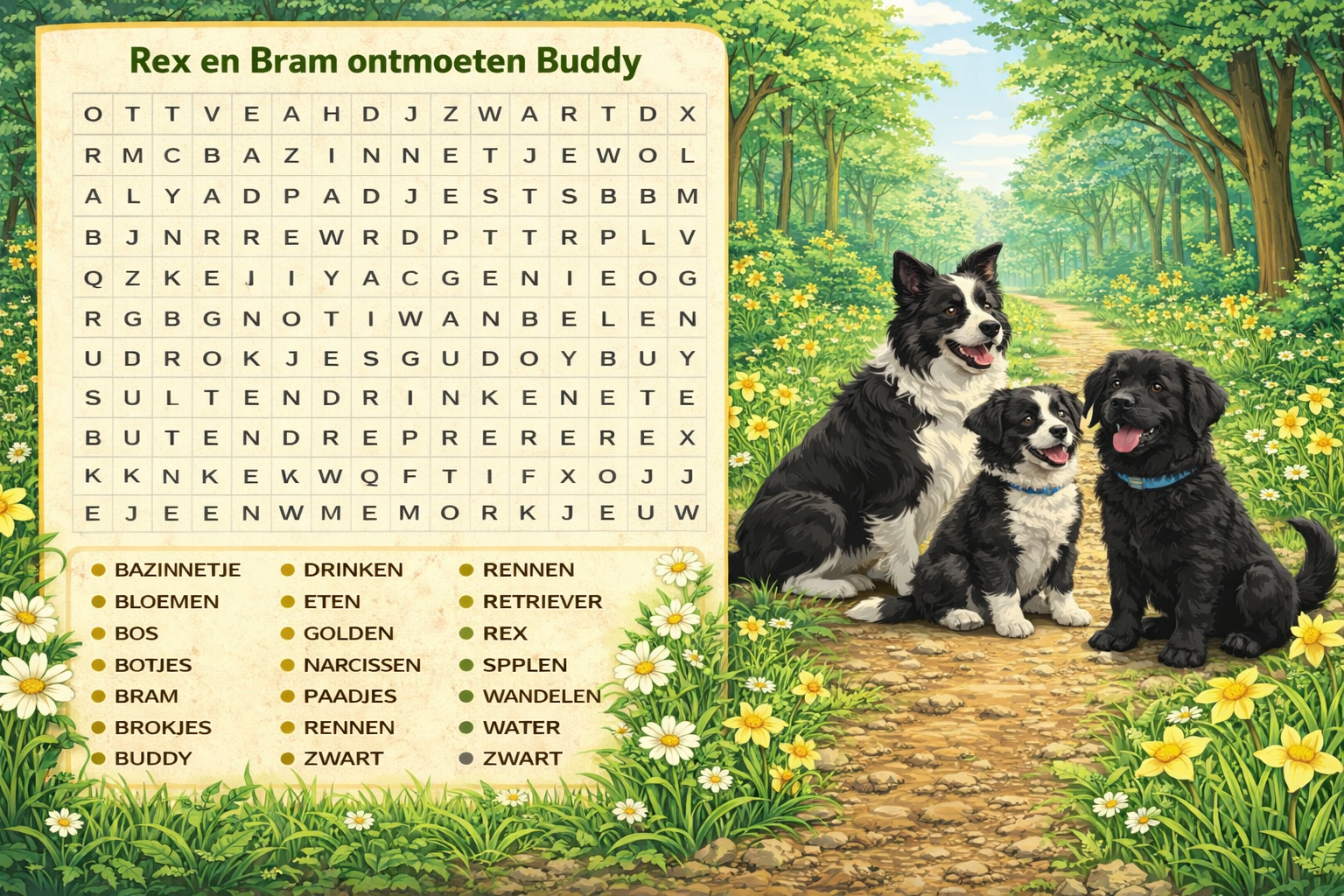 Op dat moment komt Buddy vrolijk binnen gestuiterd. Zijn staart gaat alle kanten op.