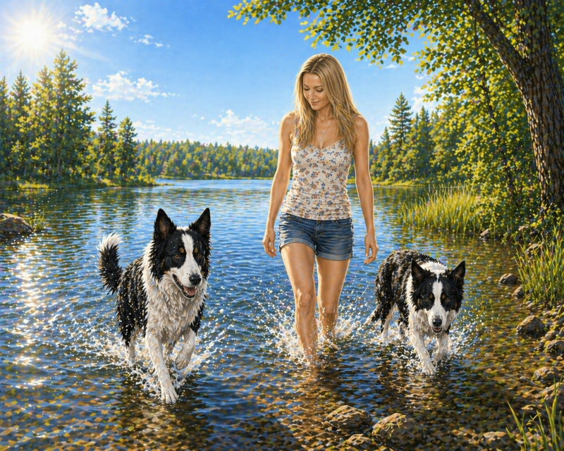 Hun bazinnetje lacht en gaat aan de rand zitten.